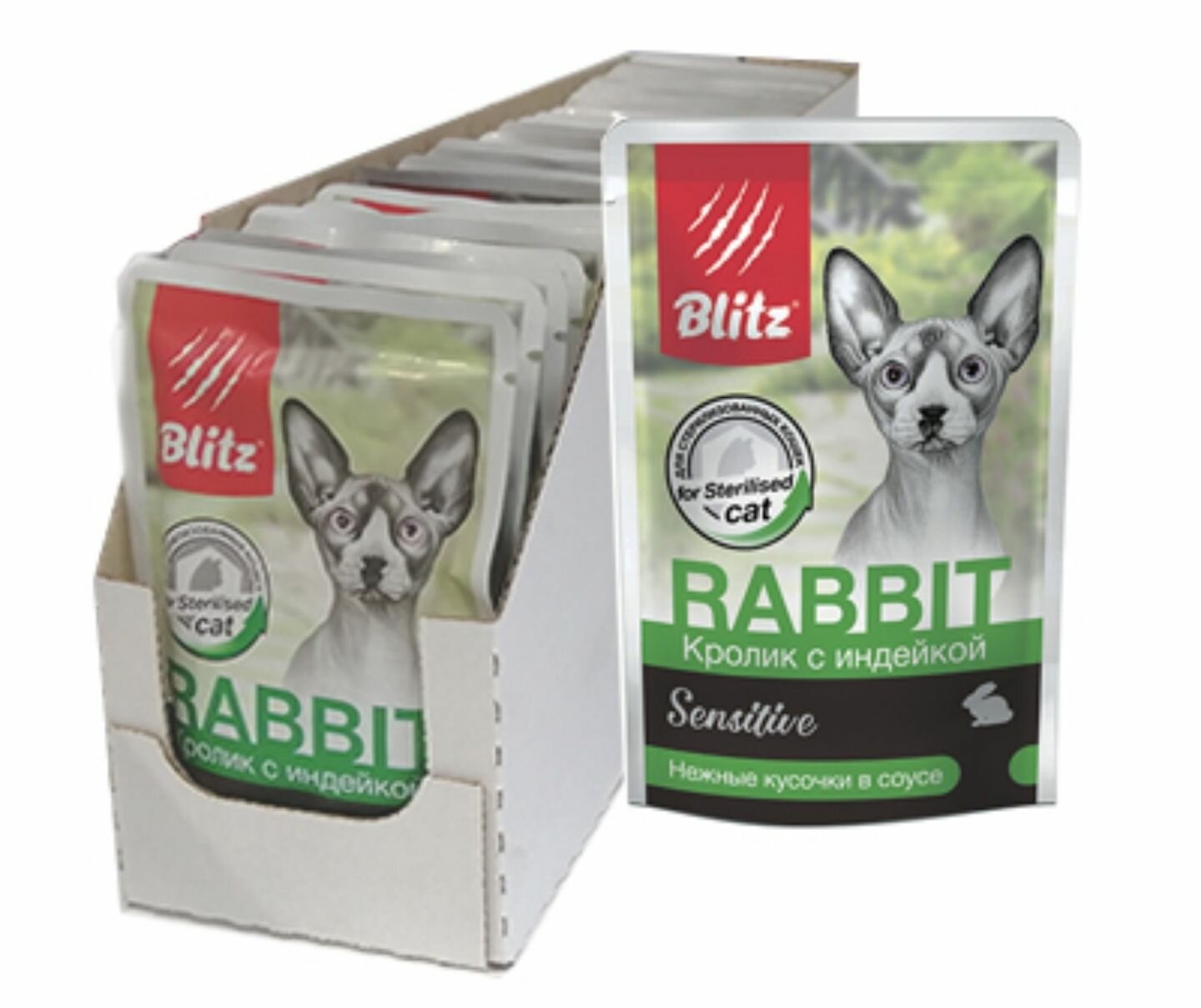 BLITZ SENSITIVE для взрослых кастр котов и стерил кошек с кроликом и инд в соусе пауч 85 гр 85 гр х 4 шт