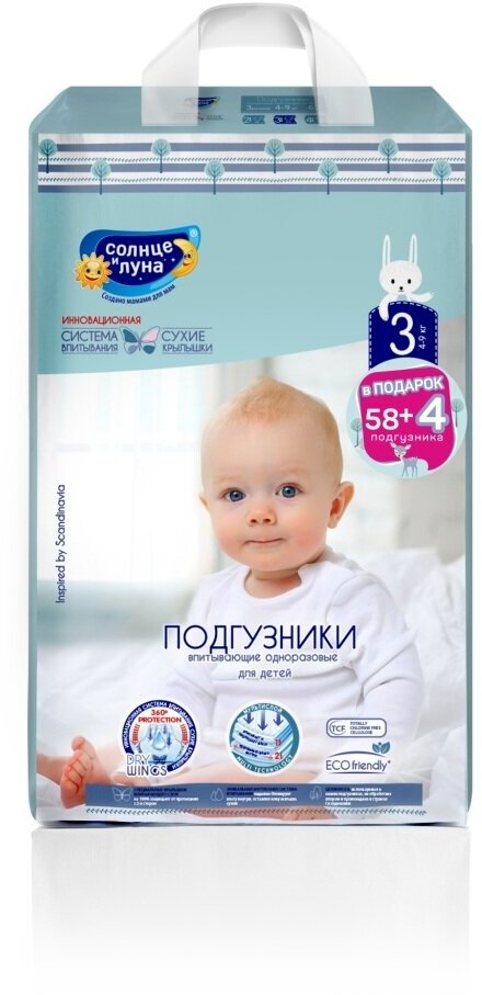 Купить Солнце И луна DRY WINGS Premium Подгузники для детей 3/M 4-9 кг 58+4шт