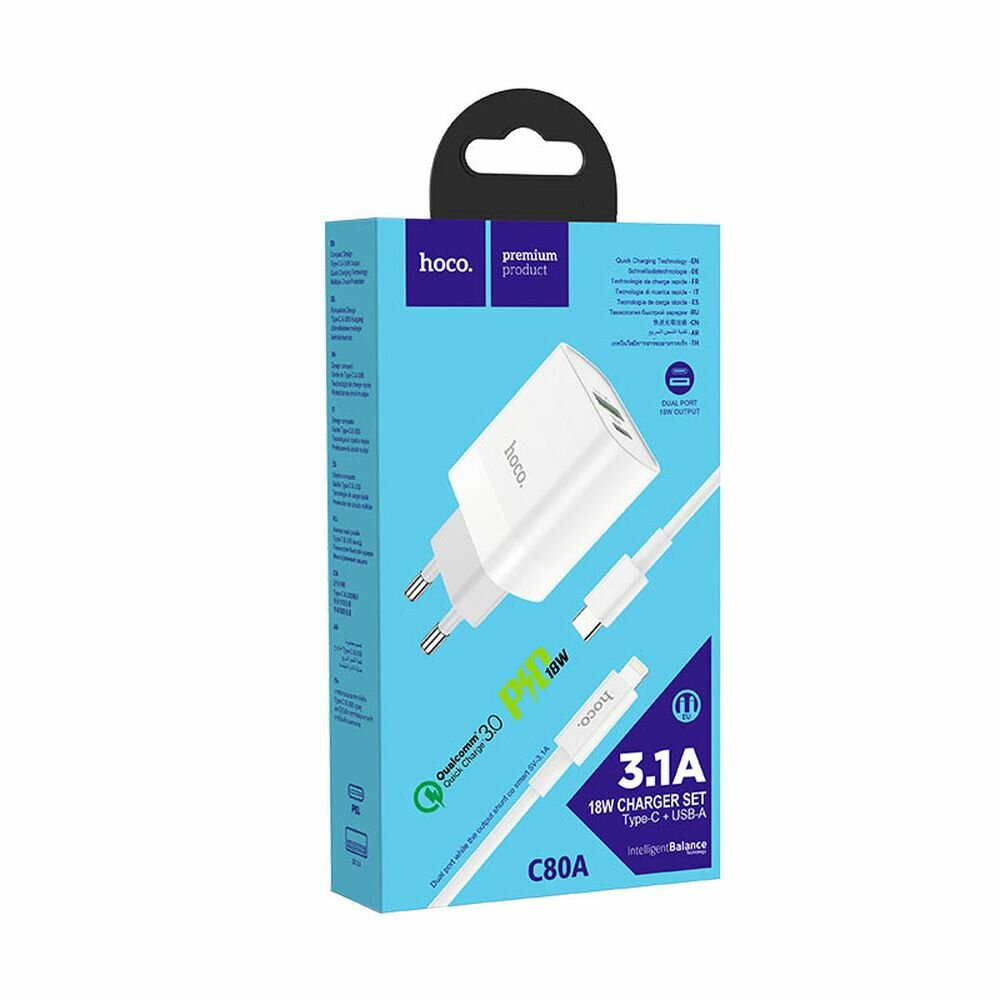 hoco C80A QC3.0, два выхода USB и Type-C, с кабелем Type-C на Type-C Сетевое зарядное устройство