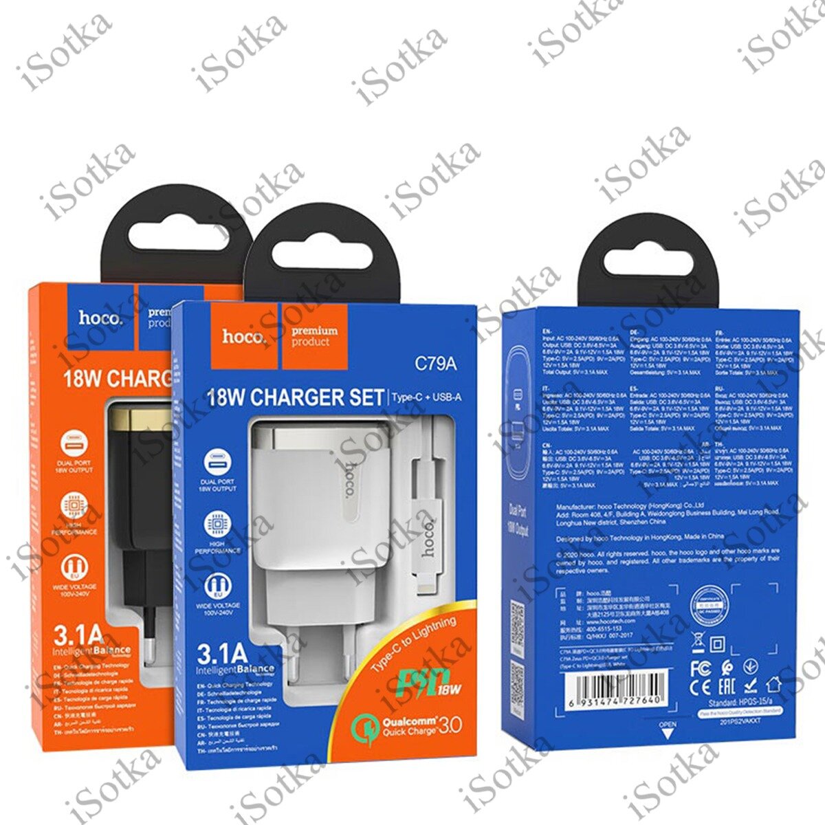 Сетевое зар. устр. Hoco C79A с шнуром Type-C на Lightning 1USB/1С PD3.0/QC3.0 3A 18W черное