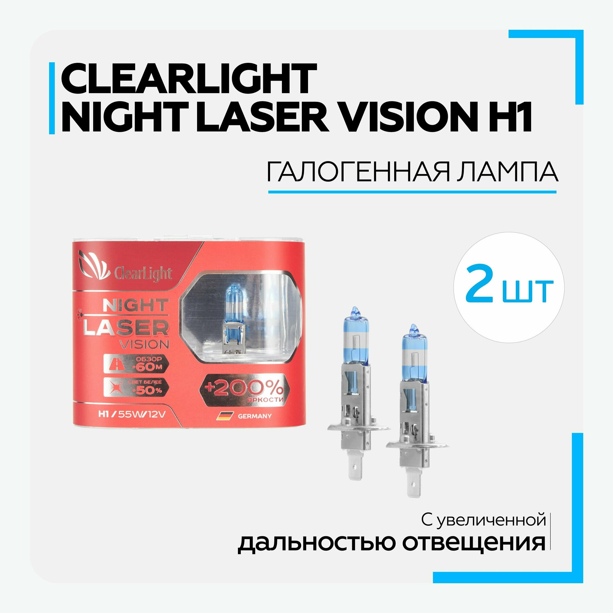 CLEARLIGHT Лампа галогенная CLEARLIGHT NIGHT LASER VISION +200% 12V H1 55W 2 шт MLH1NLV200
