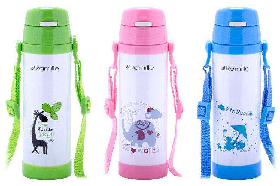 Термос для детей 500 мл. с трубочкой и ремешком Kamille KM-2086 розовый, синий, зеленый