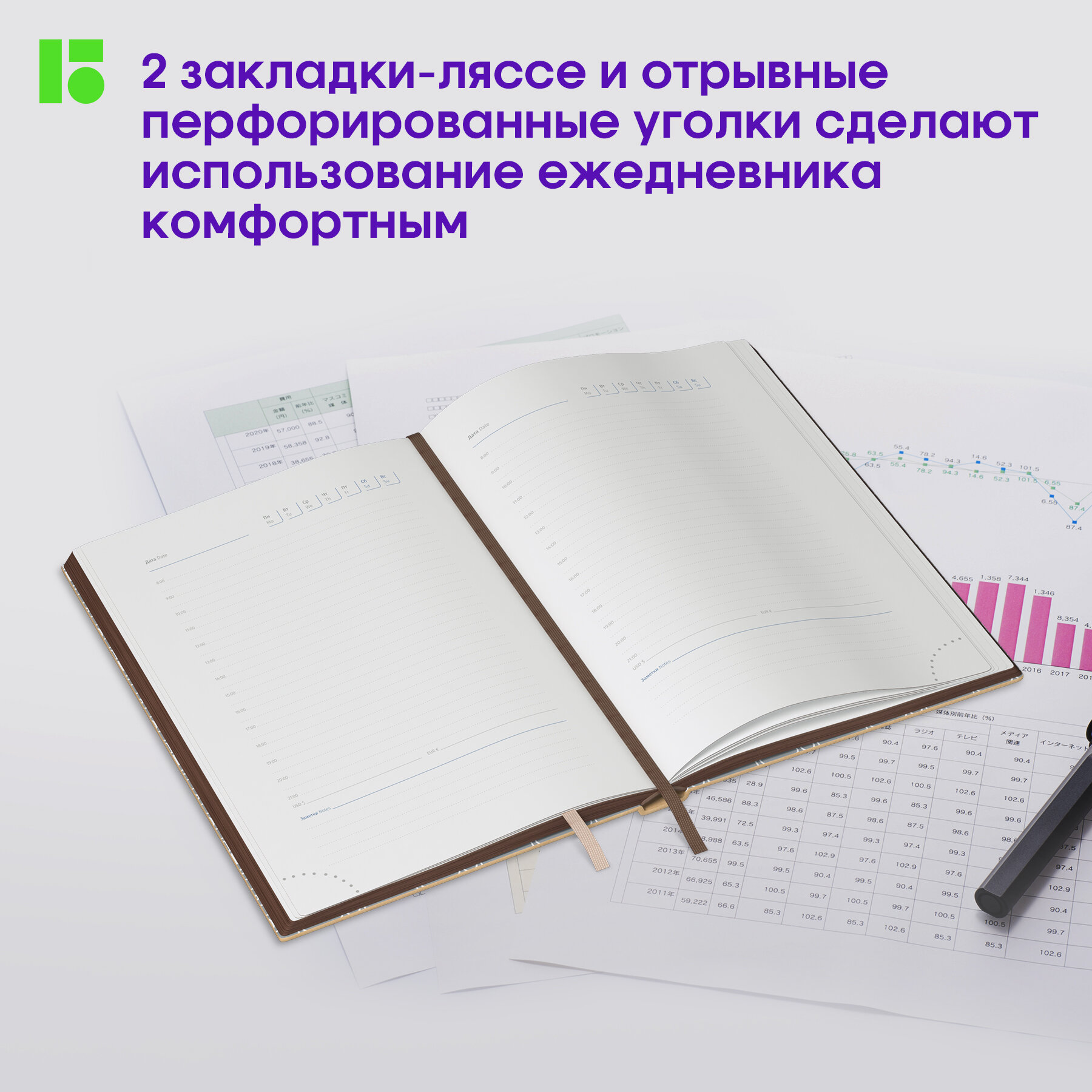 Две закладки - оказалось очень удобно. Дополнительные наклейки. Стильный дизайн. Материал ежедневника приятный наощупь. Планирование поездок можно использовать как диаграмму Ганта (пользуюсь этим инструментом ТМ). Полезные справочные материалы. |