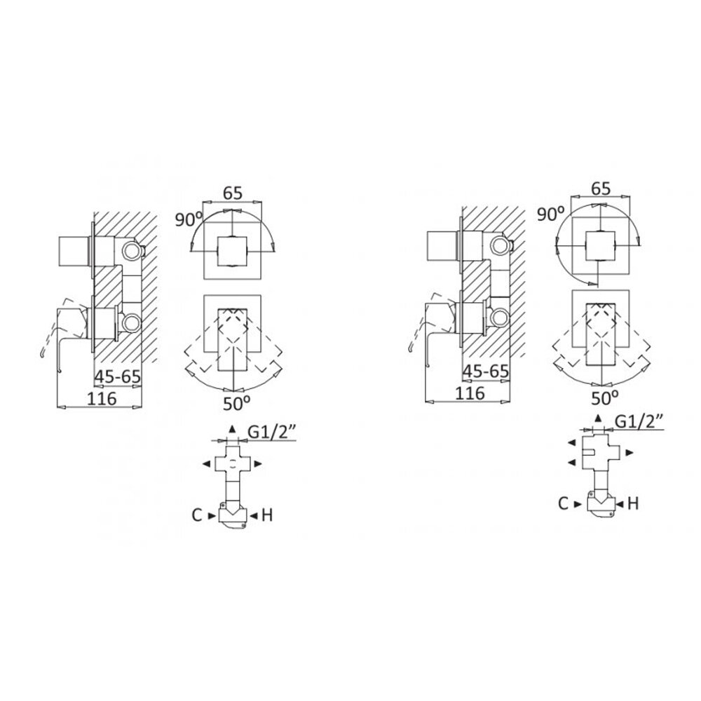 Встраиваемый однорычажный смеситель для душа с поворотным переключателем на 4 выхода Cezares PORTA-VDIM4-M-01