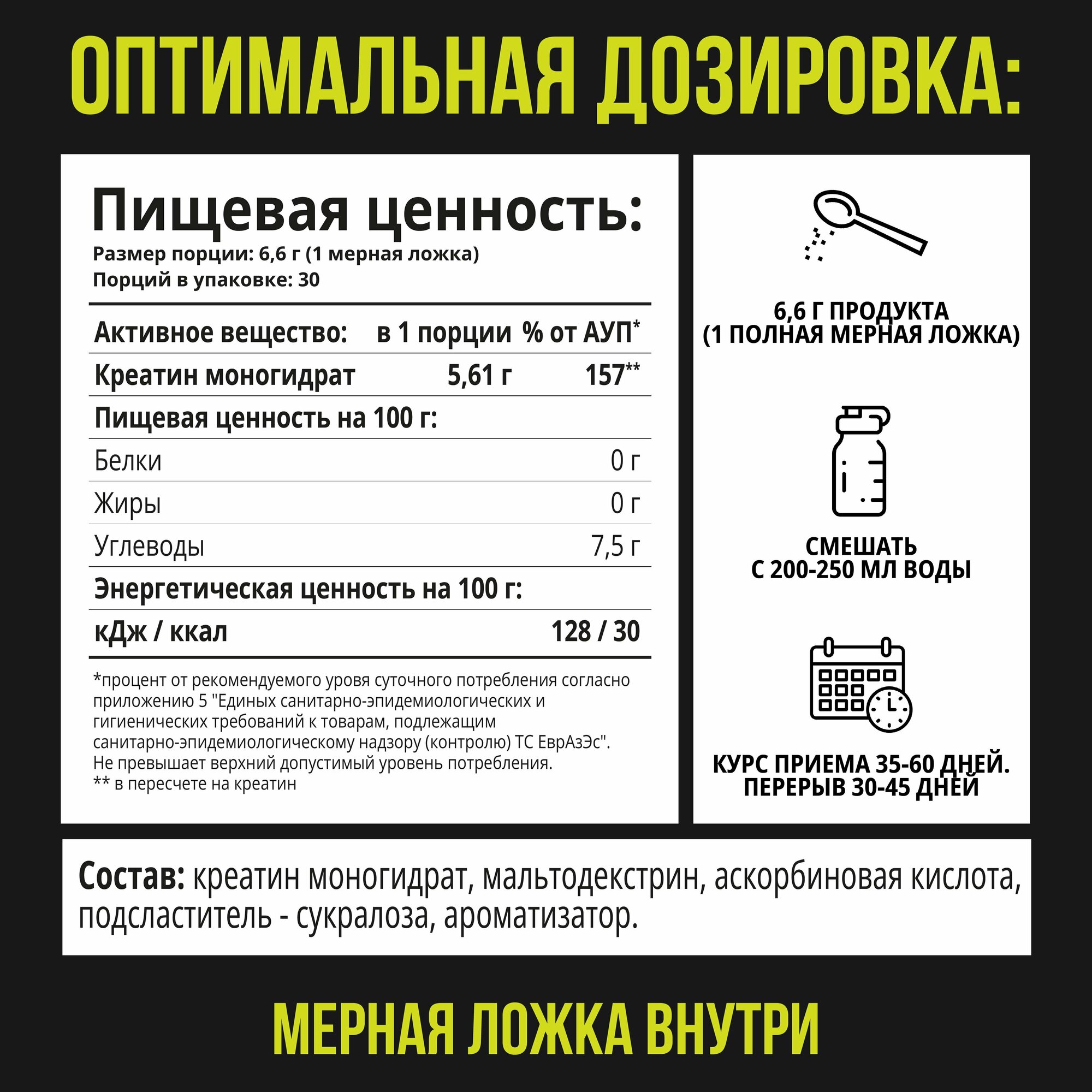 | Дополнительная информация | рекомендации по применению: Рекомендуется принимать по одной мерной ложке (6.6 г), растворив порошок в 250 мл воды или сока; состав: креатин моногидрат, мальтодекстрин, аскорбиновая кислота, подсластитель - сукралоза, ароматизатор |