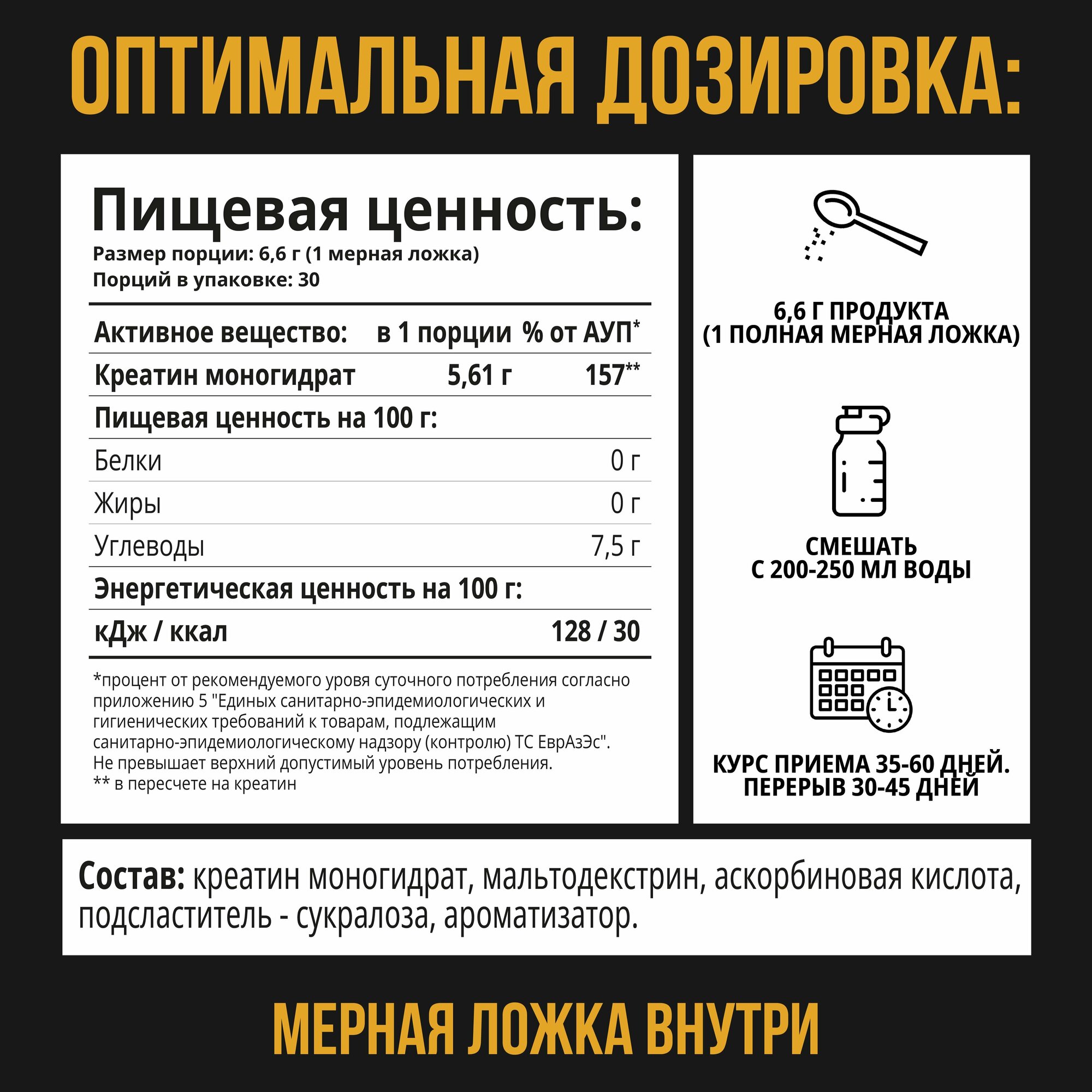 | Дополнительная информация | рекомендации по применению: Рекомендуется принимать по одной мерной ложке (6.6 г), растворив порошок в 250 мл воды или сока; состав: креатин моногидрат, мальтодекстрин, аскорбиновая кислота, подсластитель - сукралоза, ароматизатор |
