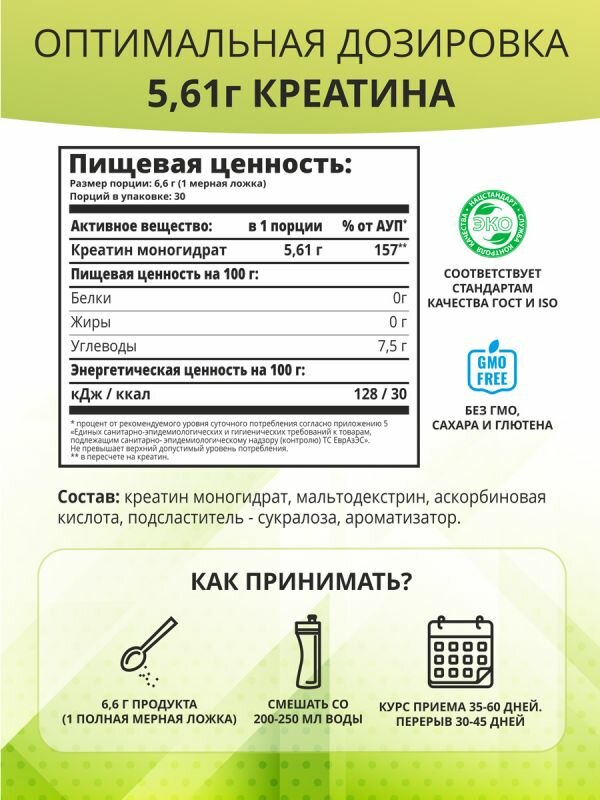 | Дополнительная информация | рекомендации по применению: Рекомендуется принимать по одной мерной ложке (6.6 г), растворив порошок в 250 мл воды или сока; состав: креатин моногидрат, мальтодекстрин, аскорбиновая кислота, подсластитель - сукралоза, ароматизатор |