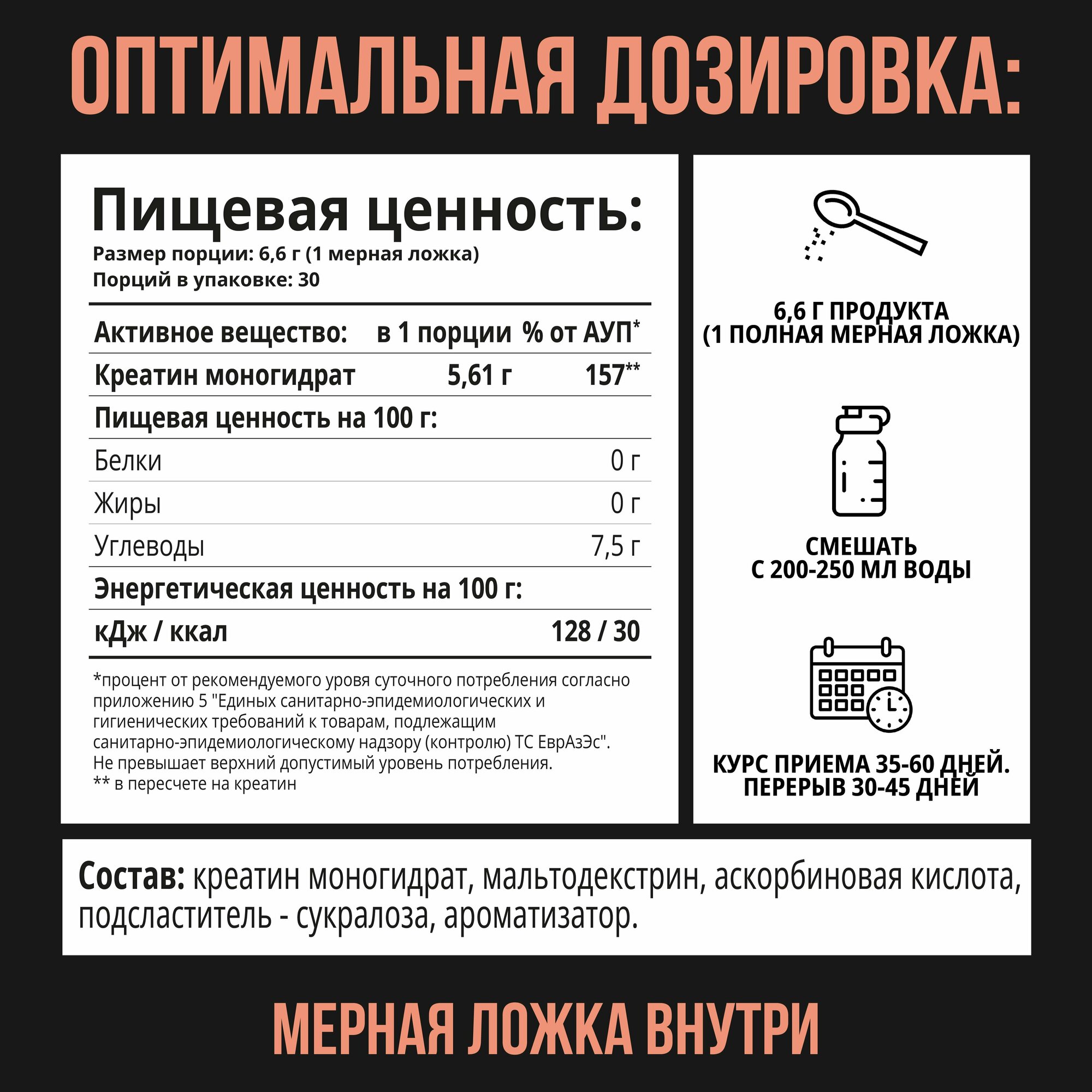Креатин моногидрат порошок, Вкус Апельсин, 30 порций, спортивное питание для набора массы тела