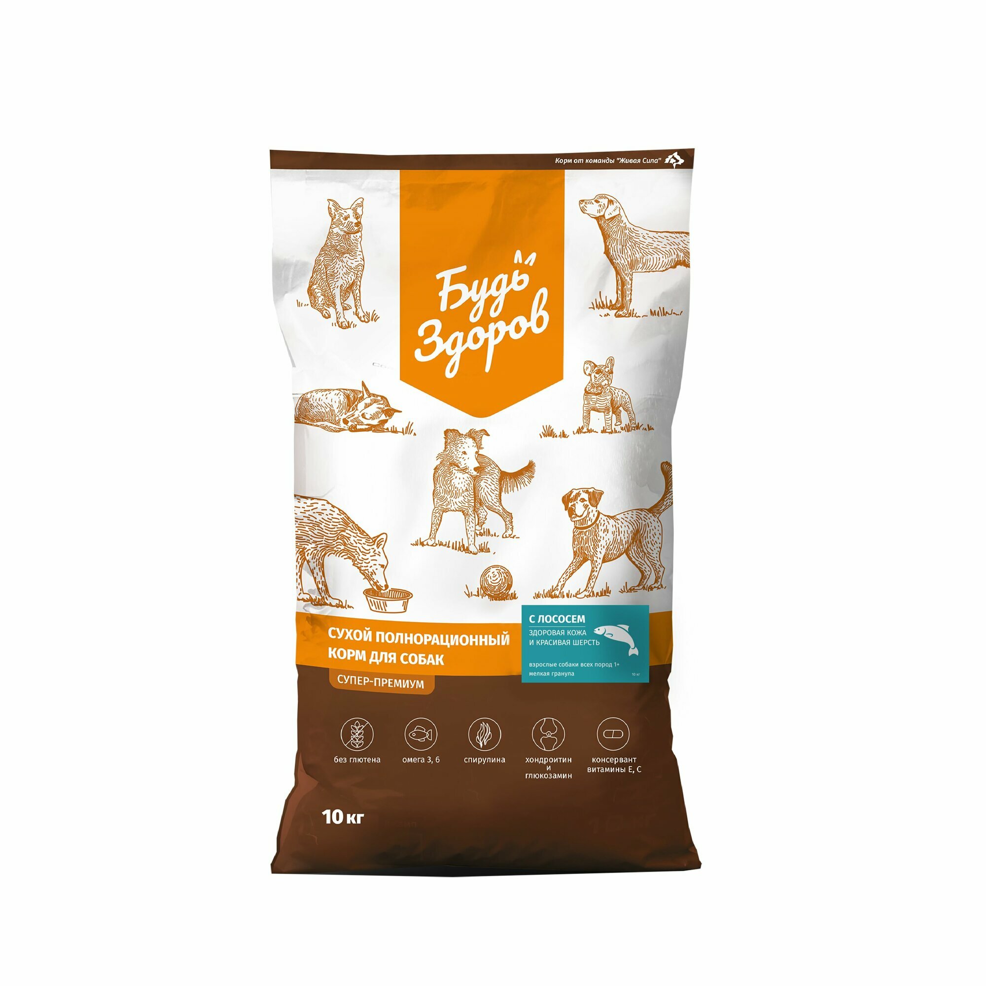 Будь Здоров. Сухой полнорационный корм для взрослых собак всех пород, с лососем, красивая шерсть и здоровая кожа, крупная гранула 10 кг