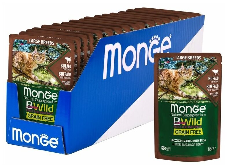 Monge Cat BWild Grain Free Large Breeds Buffalo Vegetables / Влажный Беззерновой корм Монж для кошек Крупных пород Паучи из мяса Буйвола с овощами (цена за упаковку) 85г х 28шт интересное: