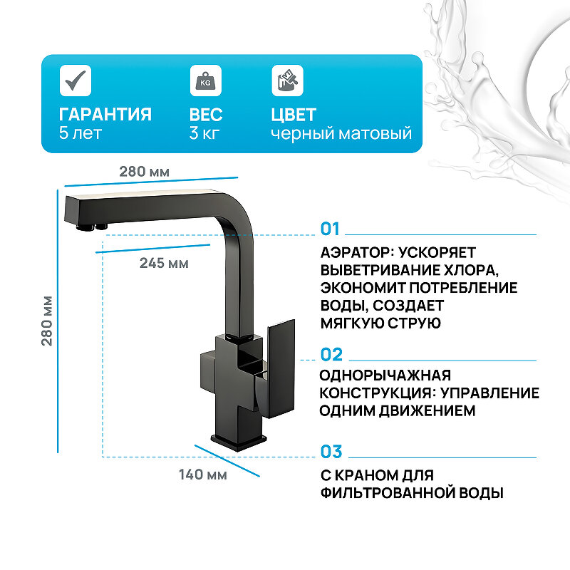 Смеситель кран для кухни и кухонной мойки с фильтром для питьевой воды Kaiser Sonat черный матовый 34044-9