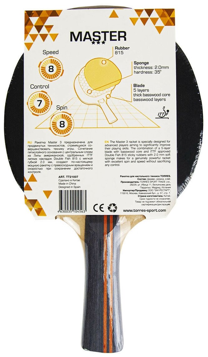 Ракетка для настольного тенниса Torres Master, 3 звезды, для тренировок, накладка 2,0 мм TORRES 1089 . интересное: