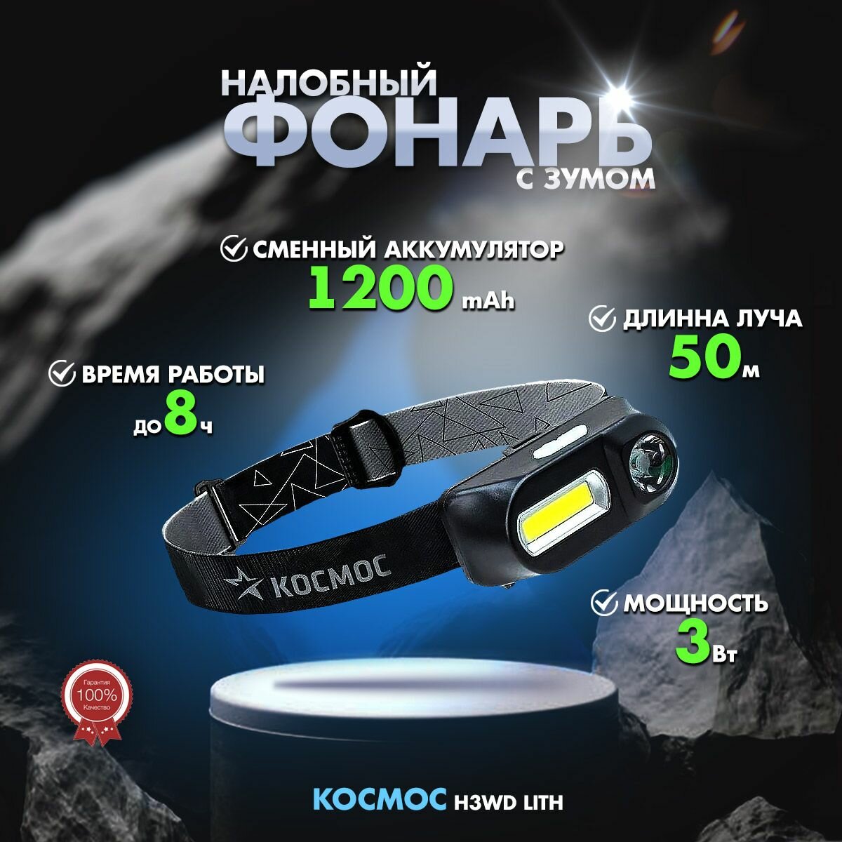 Фонарь налобный с зумом 3Вт ХРЕ 3Вт СОВ сменный аккум. 1200mAh KocH3WDLith космос KOCH3WDLITH (1 шт.)