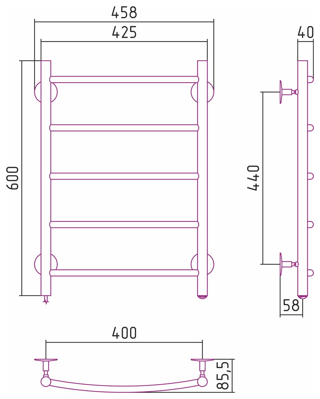 Полотенцесушитель электрический стилье Формат 40 600х400 (5) Г16, левый тэн (60 Вт)
