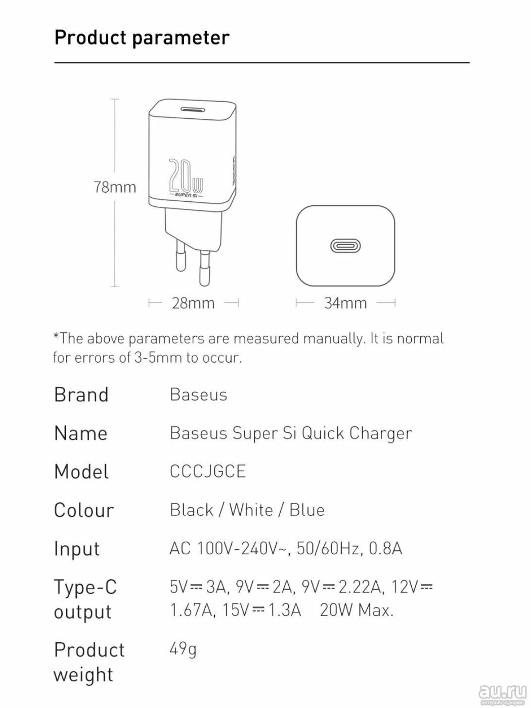 | Дополнительная информация | выходной ток Type-C: 5В/3 А; 9В/2,77 А; 12 В/2,1 А |