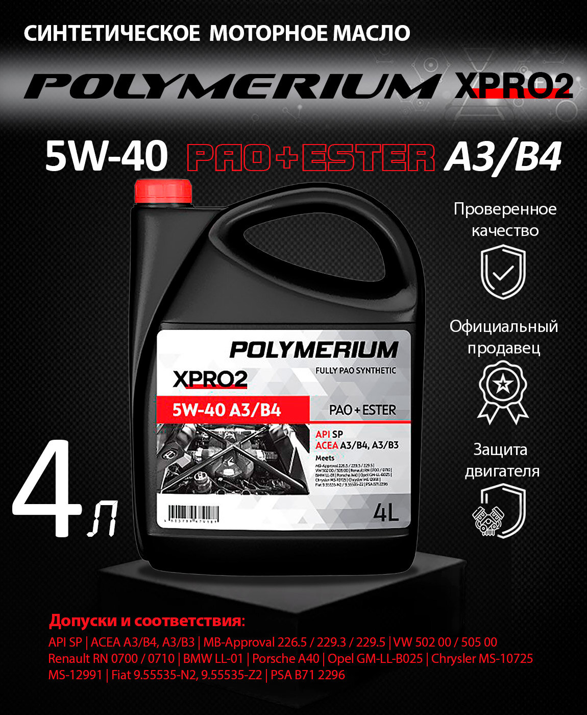 Всесезонное полностью синтетическое моторное масло XPRO2 5W-40 A3/B4 4л POLYMERIUM PLMX25404