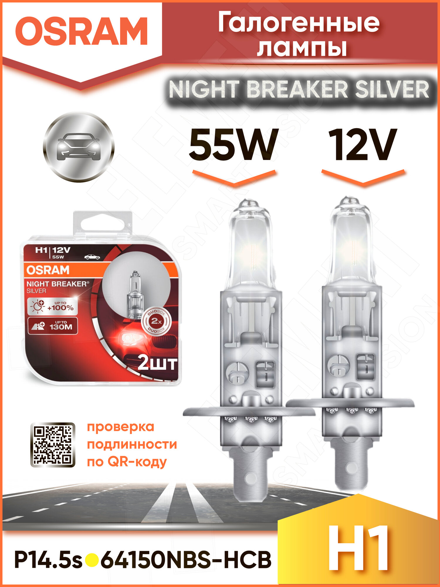 H1 12v (55w) Лампа Night Breaker Silver, Двойная Коробка Osram арт. 64150NBS-HCB