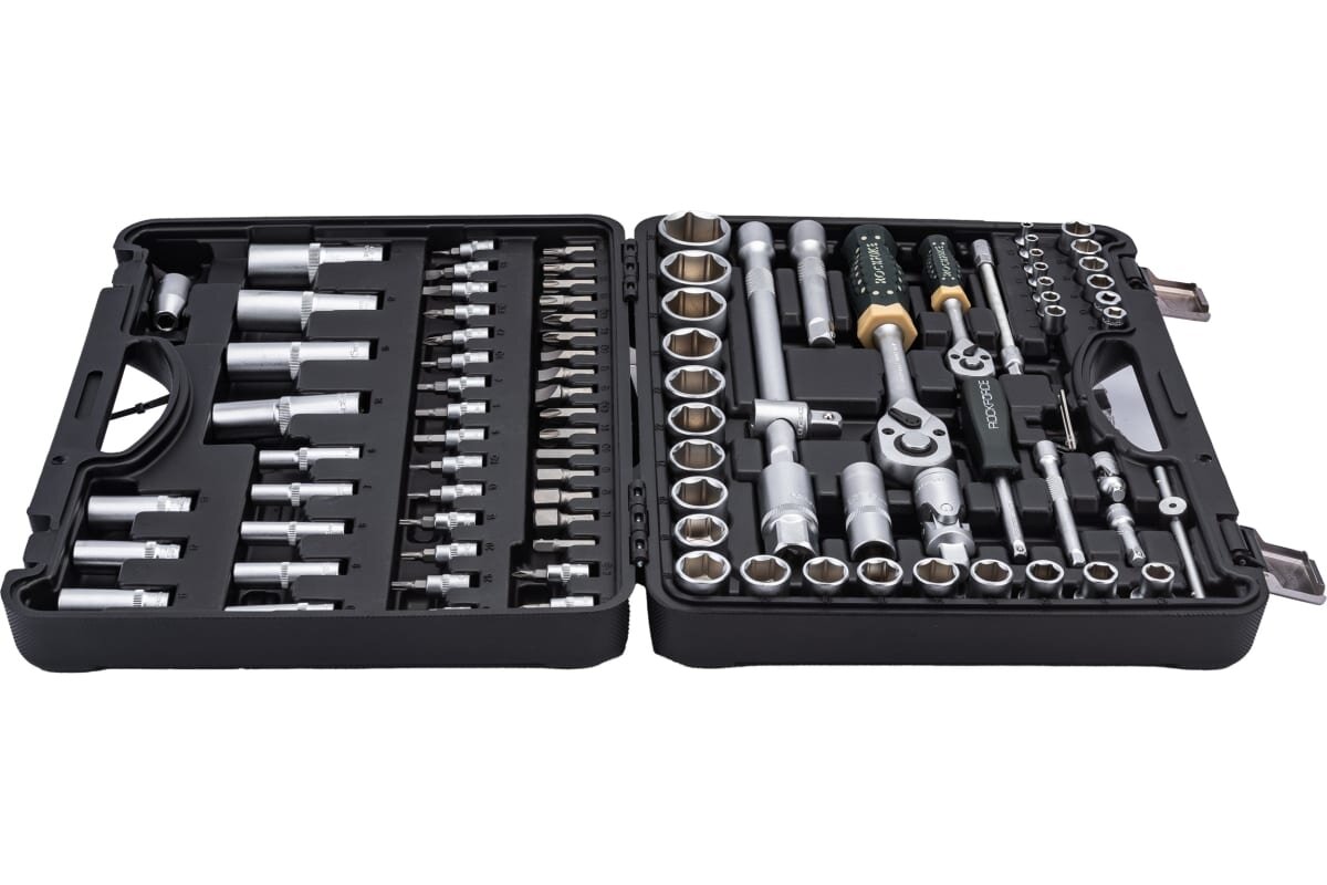 | Головки торцевые подробно | торцевые 6-ти гранные 1/4" длиной 25 мм: 4, 4.5, 5, 5.5, 6, 7, 8, 9, 10, 11, 12, 13, 14 мм; торцевые 6-ти гранные 1/4" длиной 50 мм: 6, 7, 8, 9, 10, 11, 12, 13 мм; головки-биты 1/4" длиной 35 мм: H3, H4, H5, H6, T8, T10, T15, T20, T25, T27, T30, SL4, SL 5.5, SL6, РН1, РН2, PZ1, PZ2; головки торцевые 6-ти гранные 1/2" длиной 38 мм: 10, 11, 12, 13, 14, 15, 16, 17, 18, 19, 20, 21, 22, 24, 27, 30, 32 мм (усиленные 17, 19, 21 мм); головки торцевые 6-ти гранные 1/2" длиной 77 мм: 14, 15, 17, 19, 22 мм (усиленные 17, 19 мм); головки свечные 1/2": 16, 21 мм; трещотка 1/4" 48 зубов; удлинитель 1/4": 50, 100 мм; гибкий удлинитель 1/4": 100 мм; карданный шарнир 1/4"; адаптер 3/8"(F)х1/2"(M); удлинитель 1/2": 125, 250 мм; трещотка 1/2"; карданный шарнир 1/2"; битодержатель 1/2"(F)х5/16"(F) |