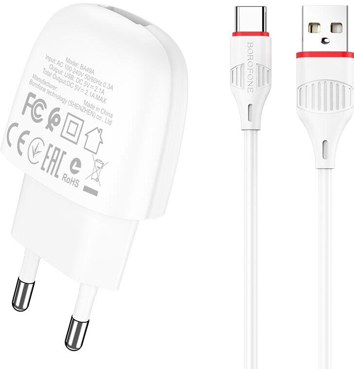 Сетевое зарядное устройство Borofone BA49A, USB, 2.1 А, кабель Type-C, 1 м, чёрное