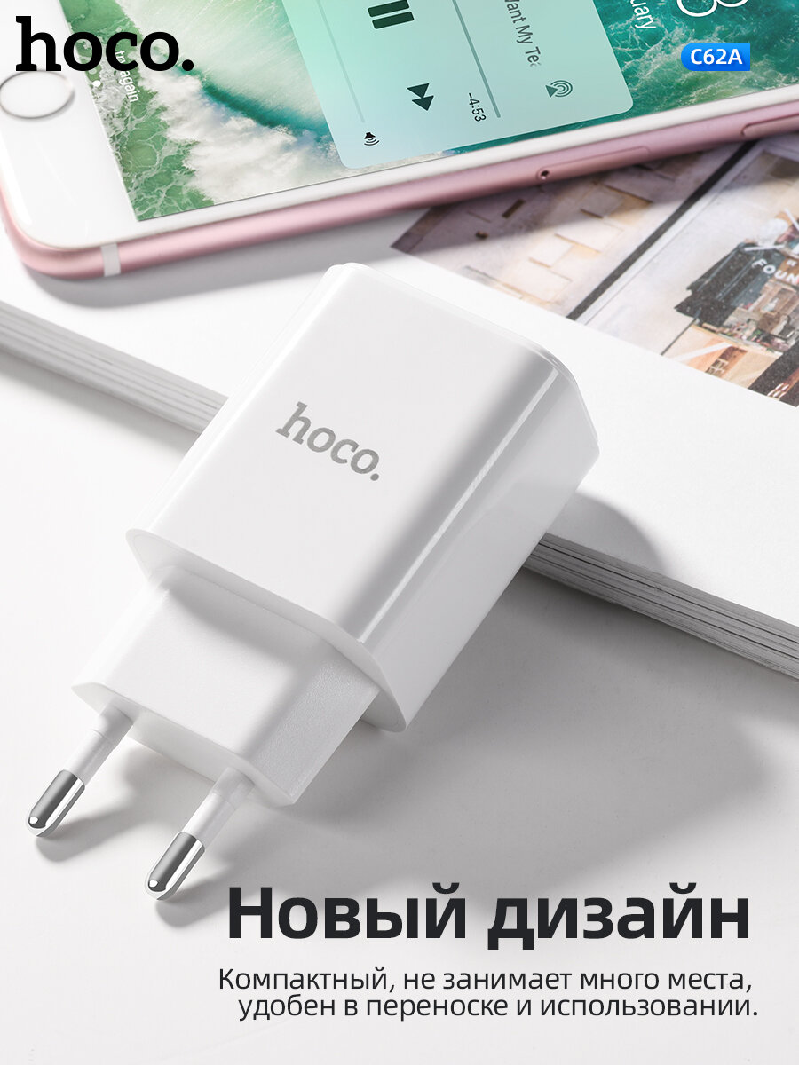 СЗУ, 2 USB 2.1A (C62A), HOCO, Type-C, Умная зарядка, белый