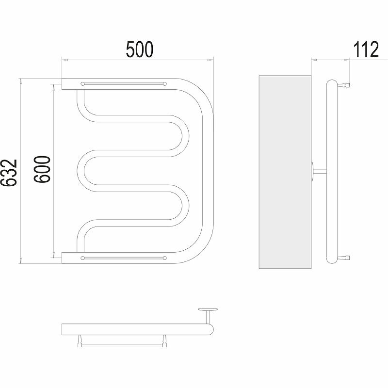 Полотенцесушитель водяной нерж сталь МП-образный Ду 25 (1") НР с полочкой 600х500мм боковое подключение б/к Фокстрот Терминус 4620768881336