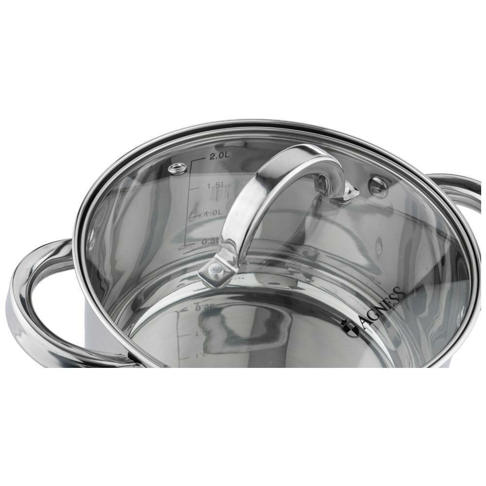 Кастрюля 2,3 л нержавеющая сталь со стеклянной крышкой, для индукционных плит Agness Classic, нержавейка с толстым дном 2,3 литра для газовой плиты