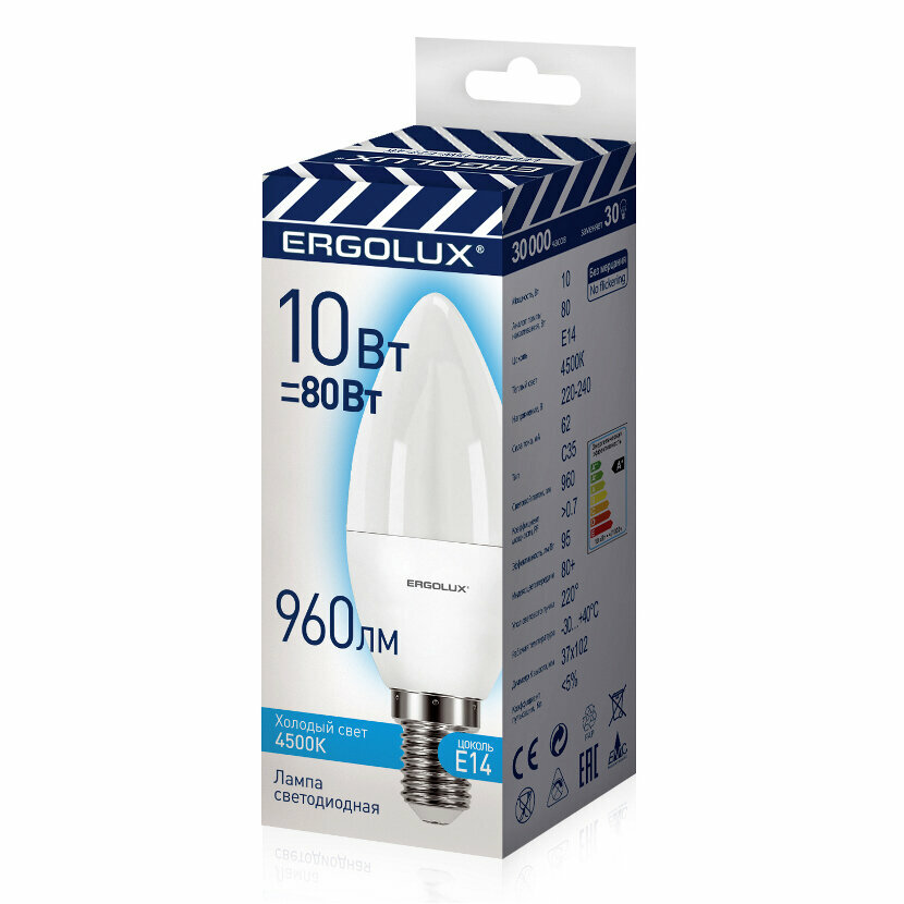 Эл.лампа светодиодная Свеча LED-C35-10W-E14-4K (10Вт=80Вт 960Lm E14 4500K 220-240В промо) Ergolux