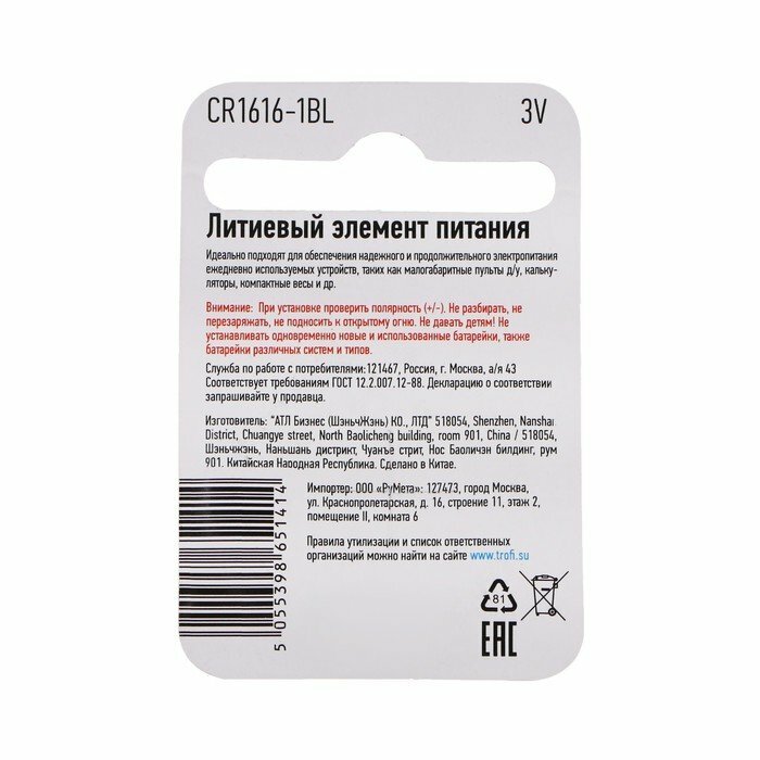 Элемент питания литиевый CR1616-1BL (блист. 1шт) Б0003645 Трофи