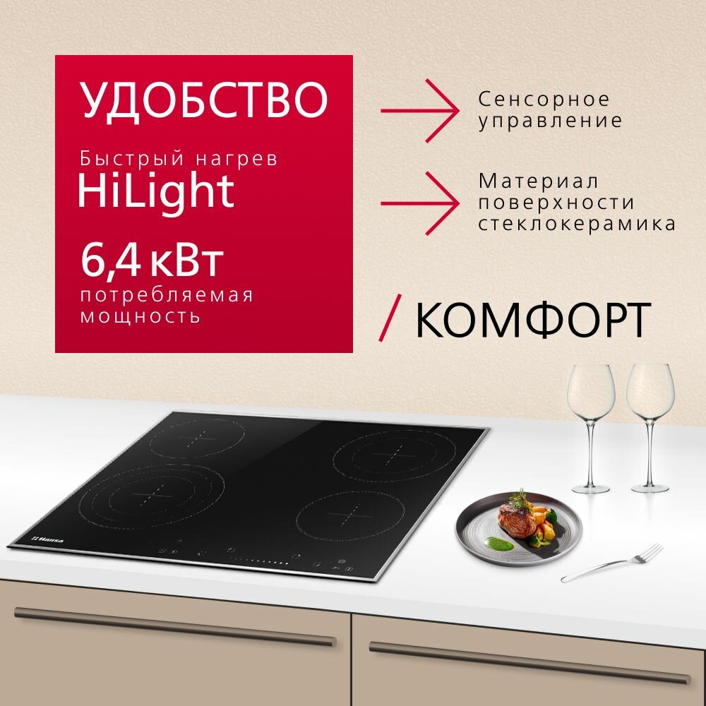 Электрическая варочная панель Hansa BHCI96808, стеклокерамическая поверхность, таймер, автоматика закипания, блокировка от детей, автоотключение, индикация остаточного тепла, черная