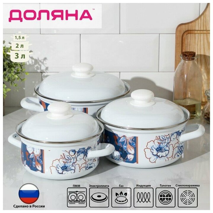 Доляна Набор кастрюль Доляна Flowers, 3 предмета: 1,5 л, 2 л, 3 л, индукция, цвет белый