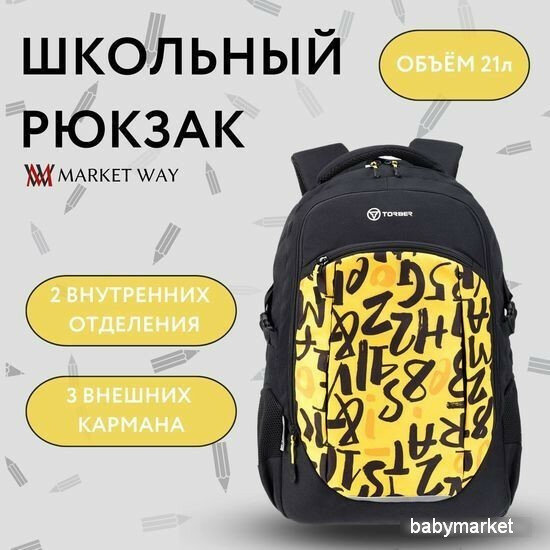 СохранитьШкольный рюкзак TORBER CLASS X T9355-22-BLK-YEL, черно-желтый с принтом "Буквы", полиэстер 900D, 46 x 32 x 18 см, 21 л интересное: