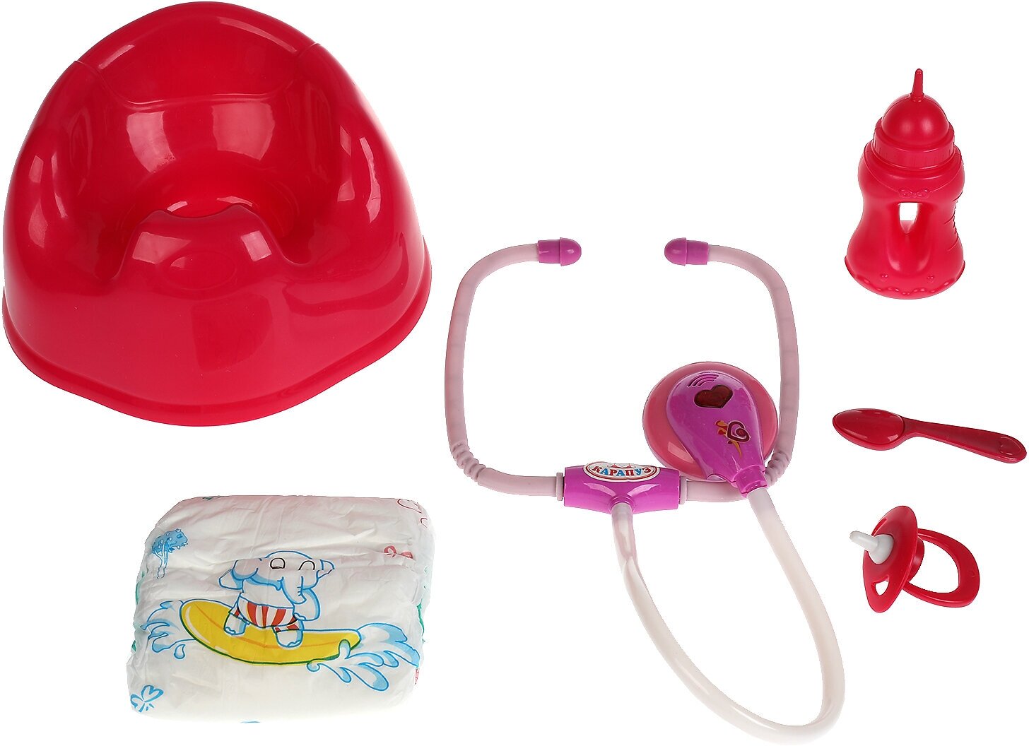 | Комплектация | пупс, горшок, подгузник, соска, бутылочка, свидетельство о рождении, стетоскоп, ложка |