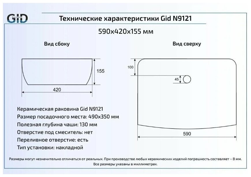 Gid Раковина Gid N9121 накладная