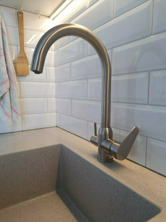 Но имейте ввиду, что он расчитан на тонкие столешницы, может специальное углубление, ну или как у них там ещё в европах... Я же решил разориться на столешницу из искуственного камня, она толщиной 37мм, и его резьбы не хватило, пришлось вырезать углубление в столешнице снизу, благо она не монолитная, а на деревянном основании, и у мастеров всё необходимое для этого было, но могли и встрять. Так же я не подумал о том, что рычаг должен иметь запас хода для поворота и не стоять очень близко к стенке. У меня же как видно на фотке места подвинуться там не было, и теперь при включении холодной воды в закрытом состоянии он ударяется об плитку, в открытом правда всё нормально из-за изменения угла, но к этому надо привыкать и аккуратно пользоваться. |
