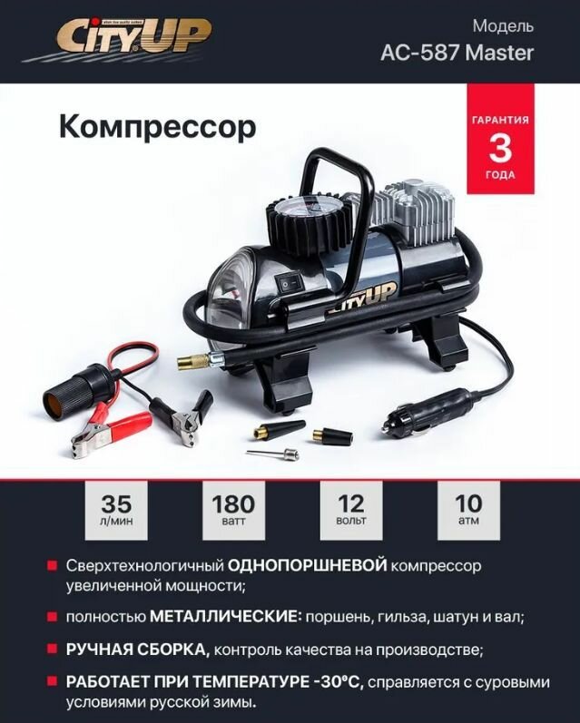 Автомобильный компрессор CityUp AC-587 Master LED фонарём 35л.мин до 10 Атм. 180 Вт. В кейсе. интересное: