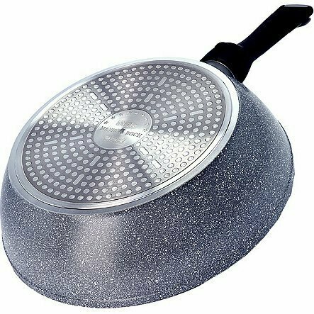 Немного похожа на сотейник (высота стенок 6 см) - меньше брызг при готовке. Диаметр - 24 см, дно внутри - 18 см. Дно снаружи - 18,5, но выступающий диск для конфорки 17см. Подошла крышка от кастрюли 24 см из стекла (без металл. ободка). |