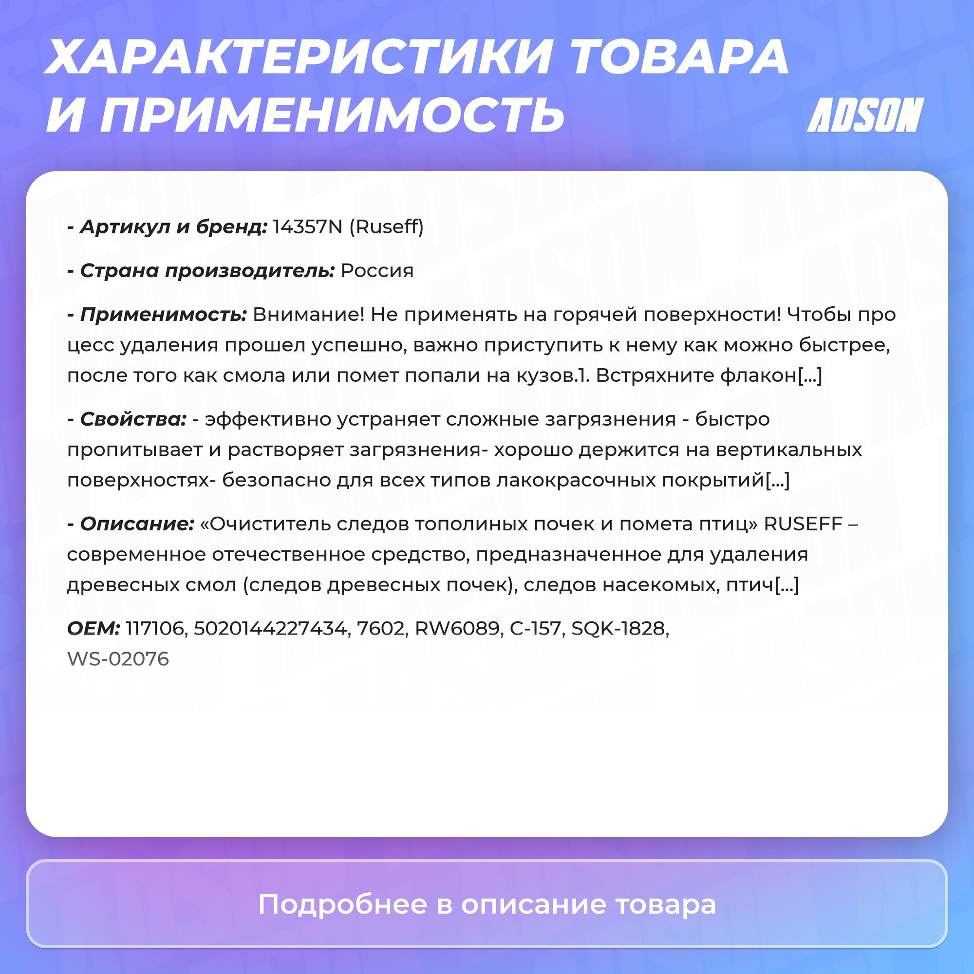 14357N RUSEFF Очиститель следов тополиных почек и помёта птиц (500 мл)