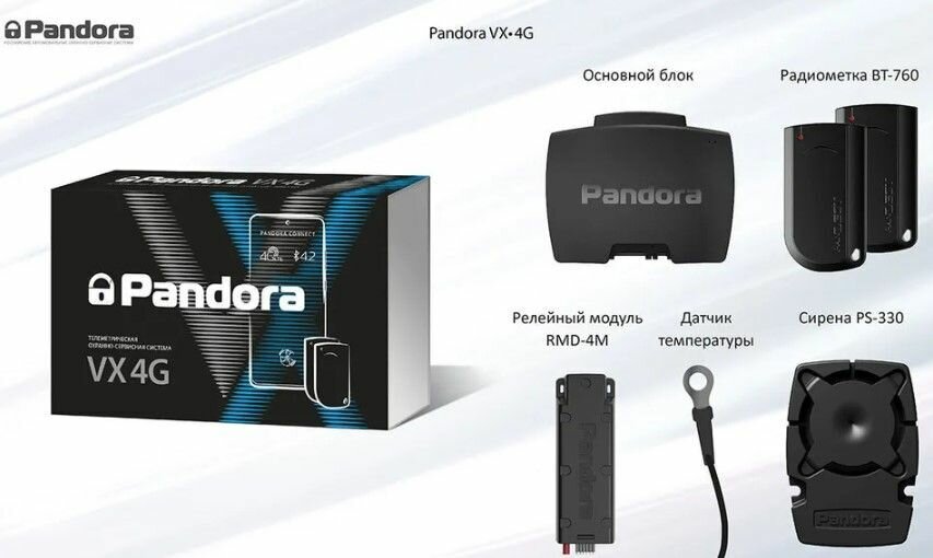 | Подробная комплектация | Основной блок VX-4G GPS 1шт, Брелок BT-760 black 2шт, RMD-4M Релейный модуль автозапуска 1шт, Сирена Пьезоэлектрическая Pandora PS-330, Кабель аналогового термодатчика L3000, Руководство по эксплуатации VX-4G, Коробка упаковочная VX-4G GPS. |