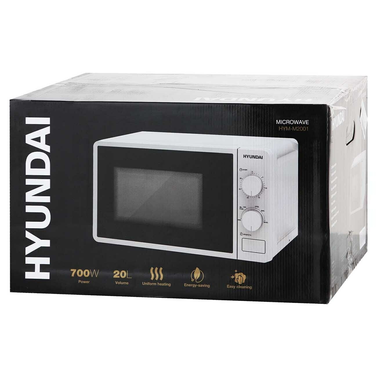 Микроволновая печь Hyundai HYM-M2001 серебристый, с механическим управлением, объем камеры 20 л, мощность 700 Вт, открывание дверцы кнопкой, функции разогрева и разморозки