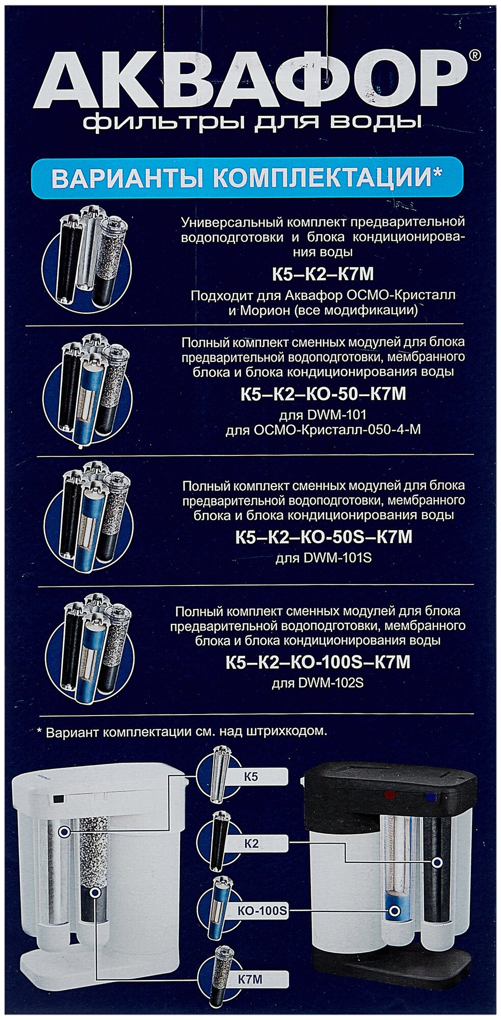 | Дополнительная информация | для фильтра DWM-101S и DWM-101; в комплекте три модуля: K5 - предварительная очистка; K2 - глубокая фильтрация; K7M - постфильтрация и минерализация |