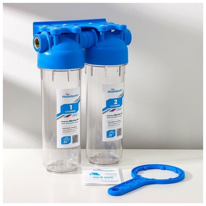 Фильтр для воды 1/2 ", 2-х ступенчатый, прозрачные копруса, Slim Line, в комплекте кронштейн и ключ, аквабрайт АБФ-2 1/2