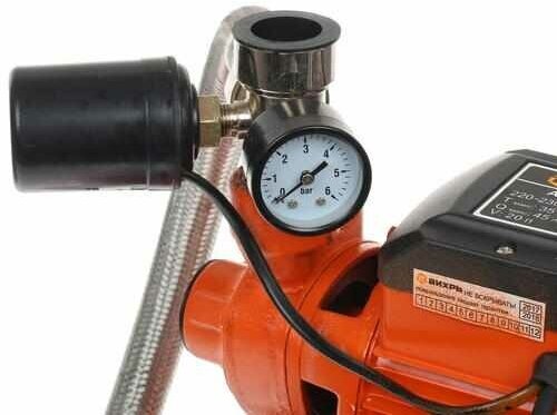 | Плюсы: | Встроенный датчик давления для автоматического включения. Манометр для контроля давления. Прочный чугунный корпус. |