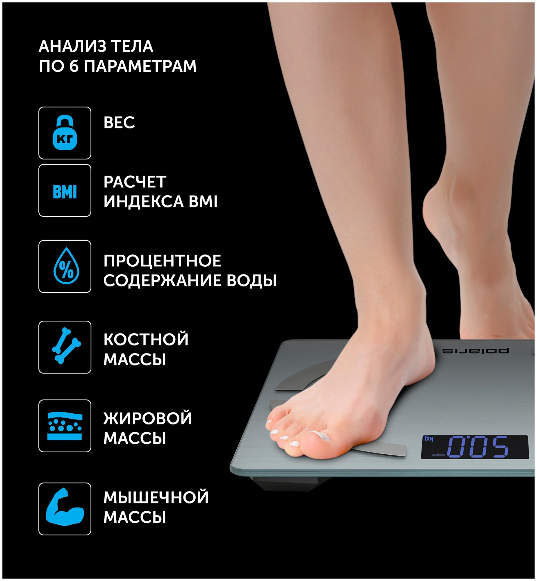 | Дополнительные функции | определение доли жировой ткани / определение доли мышечной ткани / определение доли воды / определение доли костной ткани / расчет ИМТ (BMI) / память |