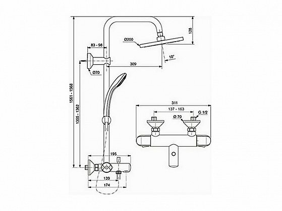 | Дополнительная информация | высота стойки для душа: 1568 мм; диаметр душевой лейки: 80 мм; диаметр верхнего душа: 200 мм |