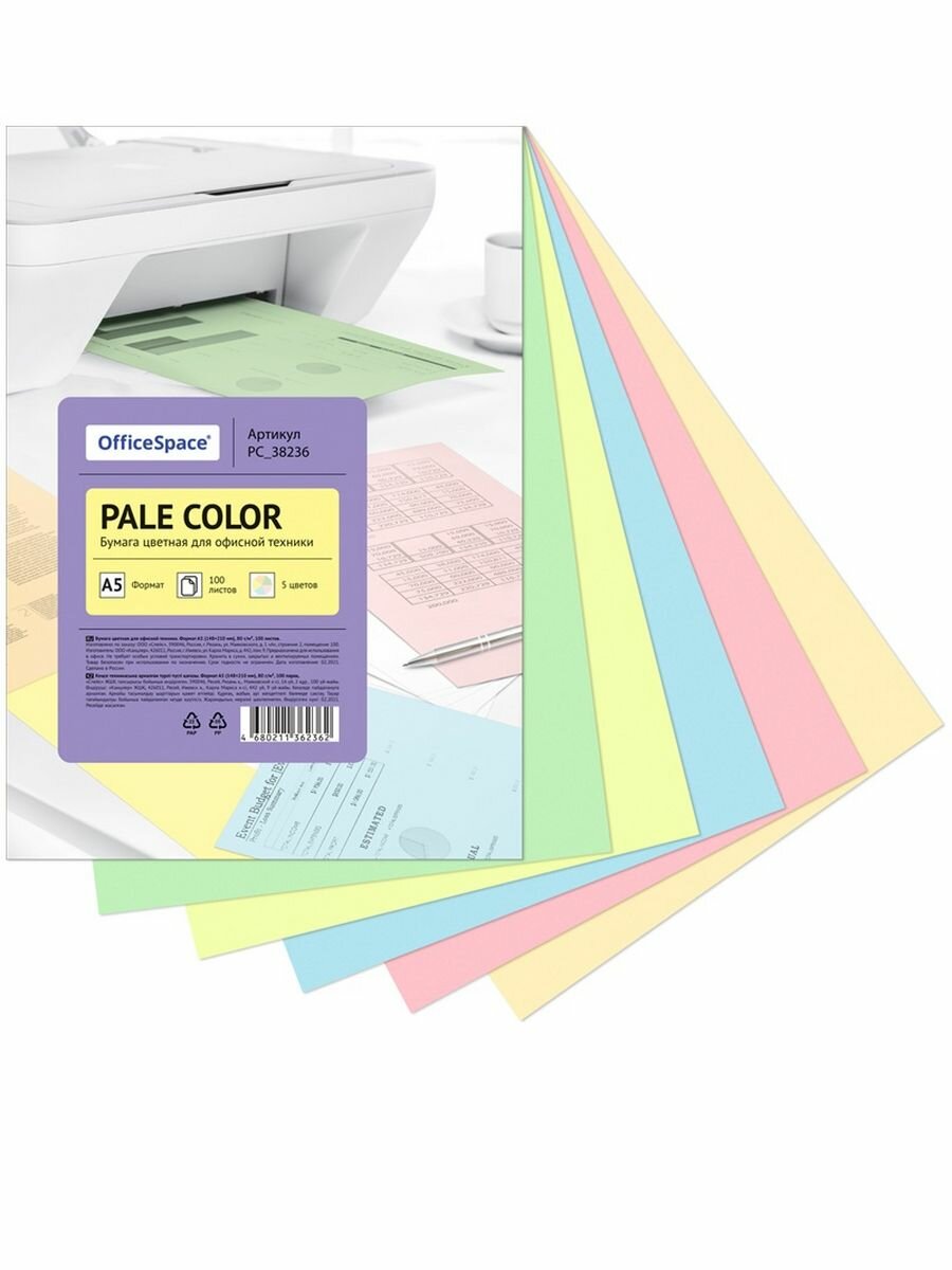 Бумага цветная OfficeSpace "Pale Color", A5, 80 г/м², 100л., (5 цветов) PC_38236 4680211362362