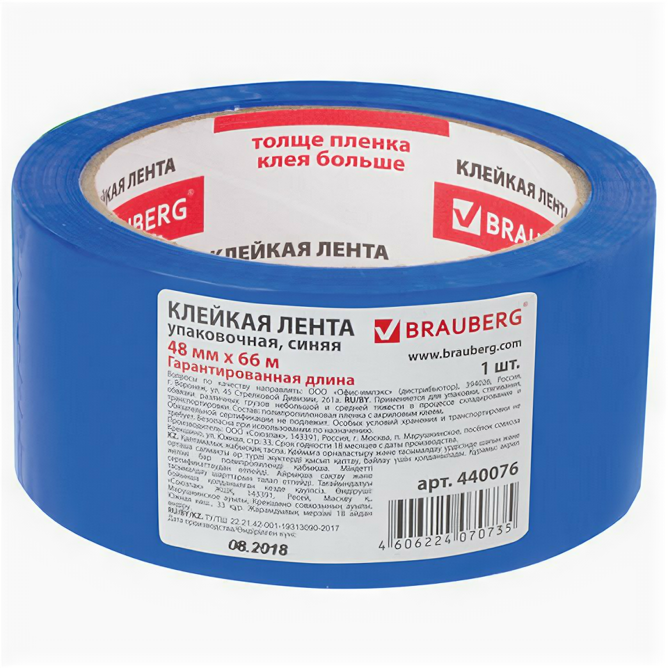 СохранитьКлейкая лента упаковочная BRAUBERG 48 мм х 66 м, синяя, толщина 45 микрон, BRAUBERG 440076 интересное: