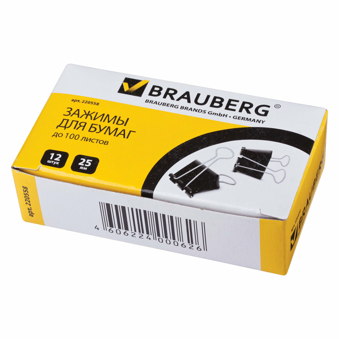 Зажимы для бумаг BRAUBERG комплект 12 шт 25 мм на 100 листов черные картонная коробка 220558