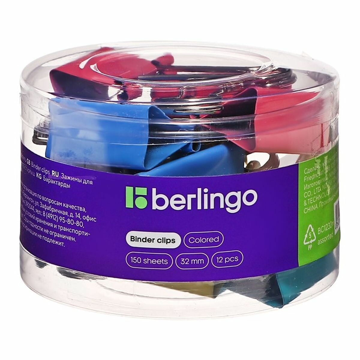 Купить Зажимы для бумаг Berlingo 32 мм, 12 штук, цветные, пластиковый тубус (BC1232m)