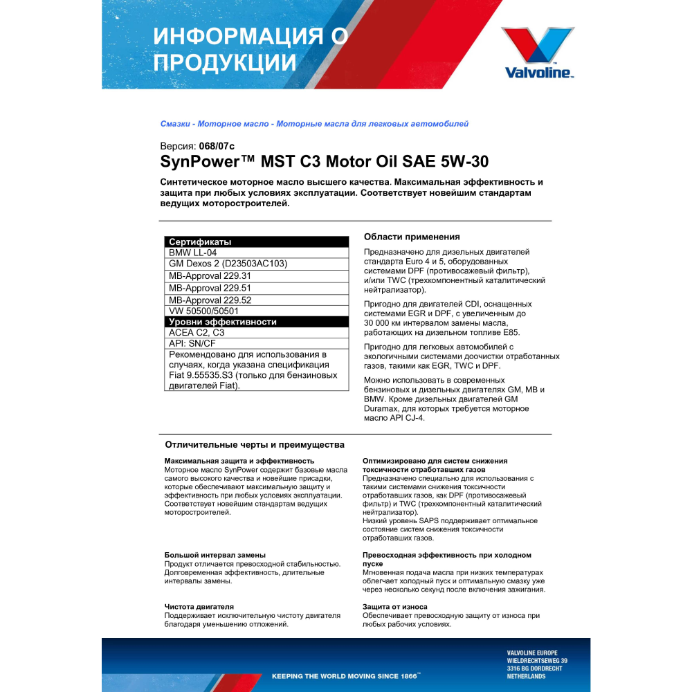 Синтетическое моторное масло VALVOLINE SynPower MST C3 5W-30, 4 л, 3.6 кг, 1 шт