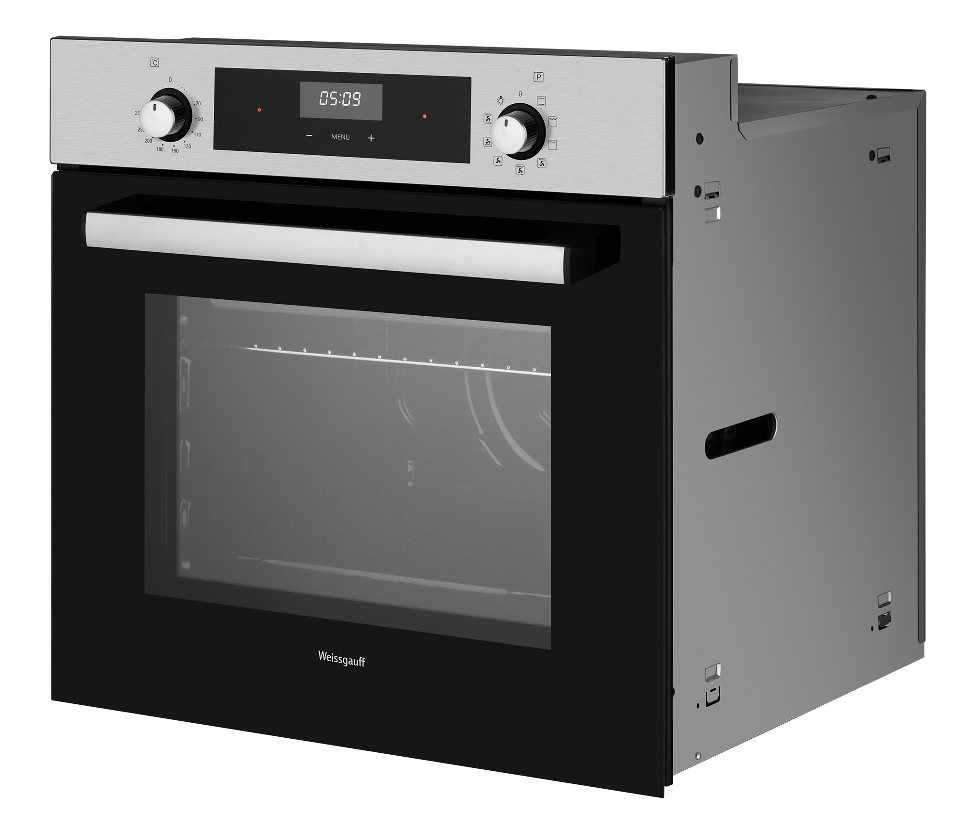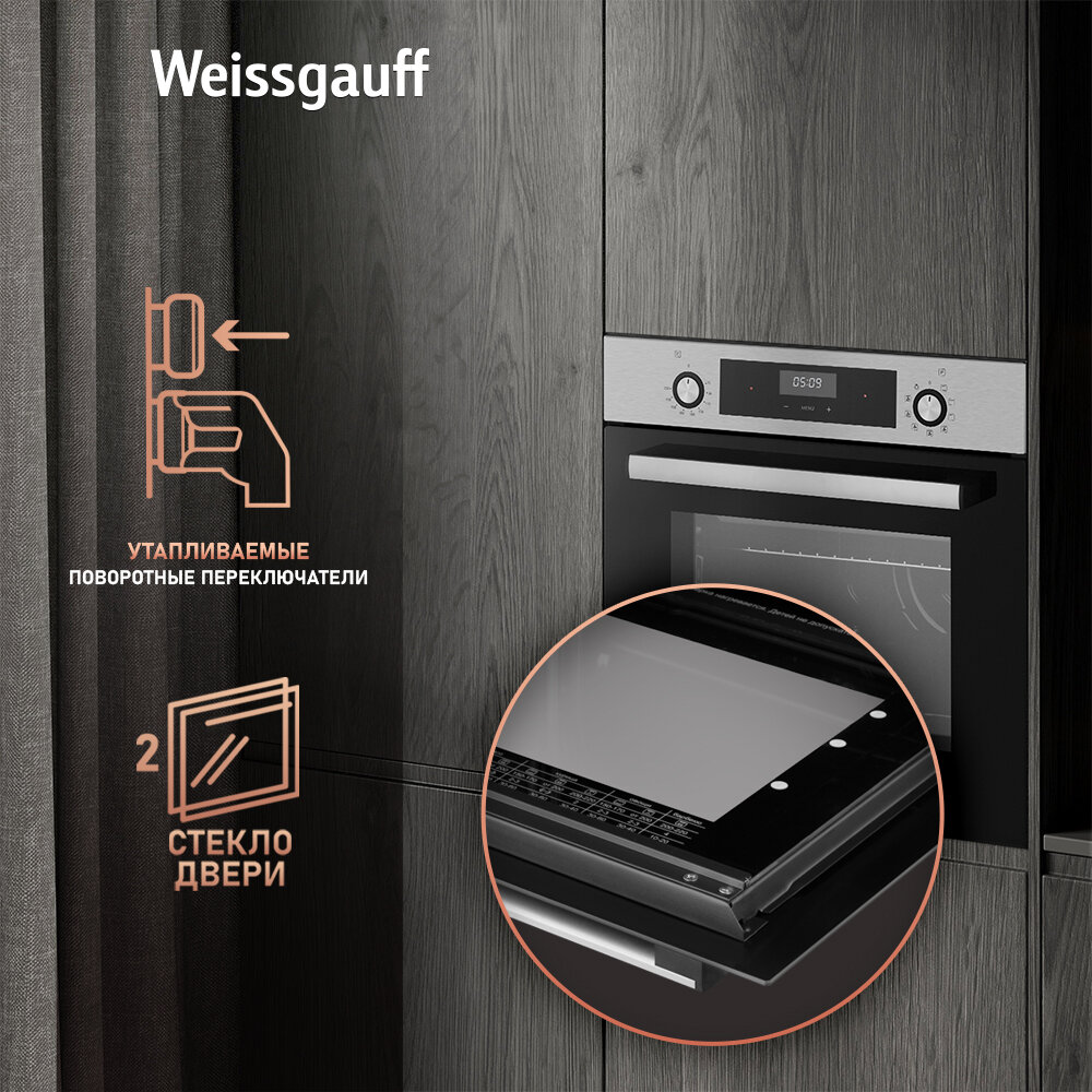 Электрический духовой шкаф Weissgauff EOA 39 PDX, 60 см, 3 года гарантии, Объем 60 литров, Утапливаемые рукоятки PIPO